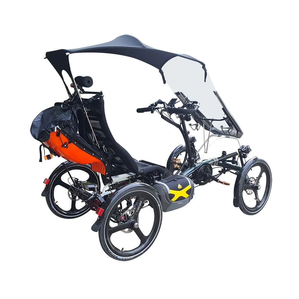 Try a Recumbent Quad We know regular recumbents are available in two-wheel and three-wheel designs, while do you imagine having one recumebnt quad and what feeling it will give you? Once you own a recumbent quad, you will feel like haveing one true pedal car, you can do more thing and go farthe with carring ample equipment. It is ideal for older folks who still want to get around under their own power, or those with balance issues or other special needs. Why model H420E H420E provides solution for those who seek ultimate comfort as well as for people with special needs, offering a versatile and adaptable vehicle with a host of practical functions. With A TrikExplor H420E, you are having one new transportation tool between bicycle and car for commuting. High seat height The high seat height help you get on and off the quad easily and provides riders with a fabulous unobstructed view for city traveling. Security features The silver strong PC reflective strip, highly visible orange hard shell bag, melodic horn increase visibility in traffic, which allow you to get a safe trip in crowded cities. We offer a complete lighting system, including headlight, rear light with brake light, turn indicator with clicking sound. You can easily set their marks in the traffic. It makes you ride more safe. Side pods Specially made side pods are ideal for storing your items and keeping them to hand without getting off your quad. Bafang Electric Drive System The Bafang electric drive system includes a powerful motor with a smooth output. Providing a seamless and easy ride from a standing start, simply pedal as normal and the motor will assist at your preferred level. Large, glare-free, waterproof 3.5 inch color display The color display has a clear and intuitive interface, loaded with functionality. It can also works excellently even in direct sunlight and raining day. Riding all year round Wind fairing, UV resistant roof, mudguards extend the quad season to all year round. There are some questions you will concern before ordering. Q: I am 190 cm tall and weight 100 kg. Is the trike suitable for me? A: Yes. Our trike is suitable for 165 to 200 cm height and the max. load is 150 kg. If you have specail needs, please feel free to contact us, we can custom the frame for you. Q: Does the trike come with separate parts or assembled? A: It comes 80% assembled,we will send you the assemble instruction and manual by email. Please also tell us your email address when you place the order. Q. Is it difficult to assemble for the average person? Would I need any tools? A: It will require 1-2 hours of assembling and adjusting for the average person. We will provide the tools. Q. Do the bike shops have parts to make repairs, as needed? A: All of the consumable parts used to build your trike are standard bicycle components that your local bike shop will be able to service. Q. What is your warranty? We provide a 3-year warranty for the frame, a 1-year warranty for motor and controller. Q. Can I pay by PayPal? Sure, you can pay by PayPal directly here. Q. What shipping way you will use? If you think the shipping cost by express is too high, we can arrange the shipping by SEA for you, it is very cheap. Please feel free to inquiry us for sea shipping. Q. Do I need to pay any tax? Yes, you need to pay some duty and taxes when the parcel reaches to your country. (In America, there is seldom taxes).