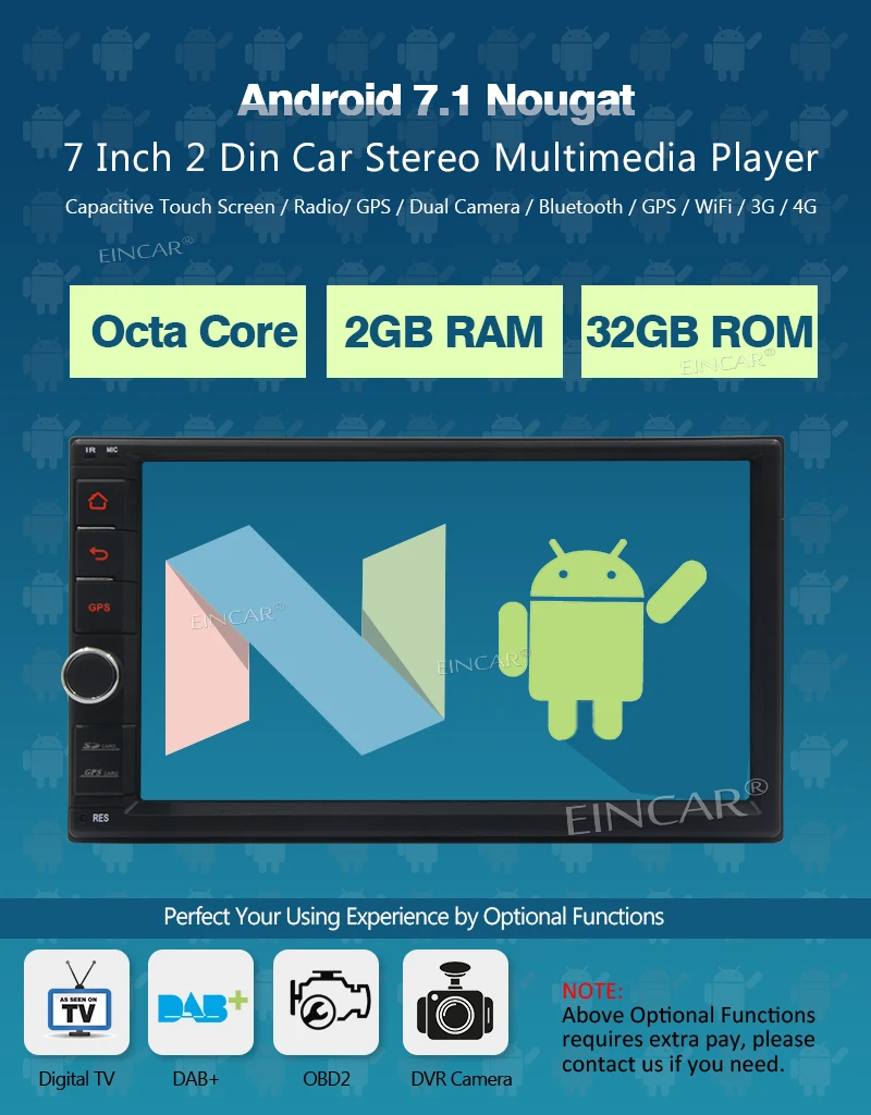 2 Din Android 7.1 Car In Dash Multimedia Player 7" HD Touch Screen Bluetooth GPS WiFi Mirror Link FM/AM Radio 2GB RAM+32 GB ROMAndroid 7.1 Autoradio with 2GB RAM and 32GB ROM,more faster and higher performance,7 inch 5 point touch screen with colorful button as you like .Universal 2 din car gps navigation with map pre-install according to your address,support online and offline navigating,3D/2D maps,you can also download your favorite map at google player store,dual zone function support radio/Bluetooth /music while navigating.Android car stereo with multi-function: steering wheel control,FM/AM RDS Radio,3G/4G WIFI(3G/4G dongle need extra purchase),iphone mirror link via WIFI,android phone mirror link via USB and WIFI, Bluetooth autoradio with hands-free calling support phone contact save and search.Support Customized made function: OBD2,DAB+,subwoofer,Digital TV,if you need these function ,please contact us,or if you have any questions,please be free to contact us,we will reply to you in 24hours,sometimes in 12 hours .High quality and service:Eligible for Amazon's 30-days returns policy,12 months warranty for quality-related issues. Free repairment or replacement on defective parts in warranty.(shipping charges not included),Please confirm this unit suit for your car and contact us if you have any questions.Overview3G/4G&WiFi/App download/3D Navigation/Radio Tuner/Bluetooth/no DVD player/Dual Zone/ File Management/HD 1080P Video/Steering Wheel Control/Mirror Link/OBD2/DVR input/Backup camera input/MP3/AUX/USB/SD etc.- Google Android 7.1 Operation System, Capacitive Touch Screen 1024*600 resolution- Octa Core A7 2.0GHZ*8, DDR3 2GB RAM, 32GB ROM- Support extended Media Card/USB Stick- Multi-Languages: it has more than 60 languages to select- Choose open unit logos and Radio Area in Factory Settings- Built-in WiFi Modem, High Performance, Low Power Consumption- Support 3G/4G Internet, need extral 3G/4G USB Dongle- Build-In GPS Navigation, Preset FREE Offline GPS Map, Support Google Maps online Navigating- Support Dual Zone function, while Navigating you can listen music- Support Android Multimedia Player, it can play Music/Movie/Photo from connected TF Card.- Online Entertainment, support online video, TV, movie, music, radio, Youtube, Yahoo, MSN...- Online Communication, keep connected through Twitter, Facebook, Gtalk, Gmail and other services- Support Google Play Store, you can download thousands of Apps from here and you can down many popular games.- 4 x 45w Surround Stereo, Subwoofer Output- Support Bluetooth hands-free function, built-in microphone- Support A2DP Bluetooth, can play stereo music through Bluetooth from your Phone- Radio Tuner, 30 Preset Radio Stations (FM: 3*6, AM: 2*6)- Support Rear View Camera input and reverse trigger Control